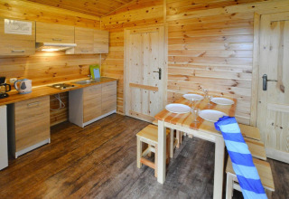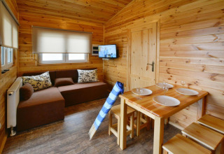 Ihr hölzernes Ferienhaus ist ebenerdig und ideal für eine Gruppe von bis zu 6 Personen. Im Inneren finden Sie ein gemütliches Wohnzimmer mit Schlafsofa für zwei Personen und TV, eine einfache aber praktische Küche, zwei separate Schlafzimmer und ein Badezimmer mit Dusche. Treten Sie hinaus auf Ihre überdachte Terrasse mit Gartenmöbeln – ideal für ausgedehnte Frühstücke, einen Drink bei Sonnenuntergang oder späte Gespräche an der frischen Meeresluft.