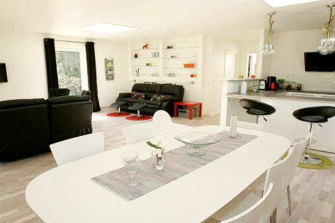 Ein schöner Rückzugsort! Das helle Wohnzimmer und der Zugang zur Terrasse machten es leicht, die Natur zu genießen. Die nahegelegenen Restaurants, insbesondere Lodsens Gaard, waren eine nette Ergänzung, insgesamt eine sehr entspannende Erfahrung,