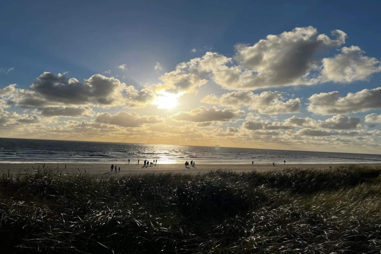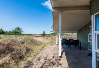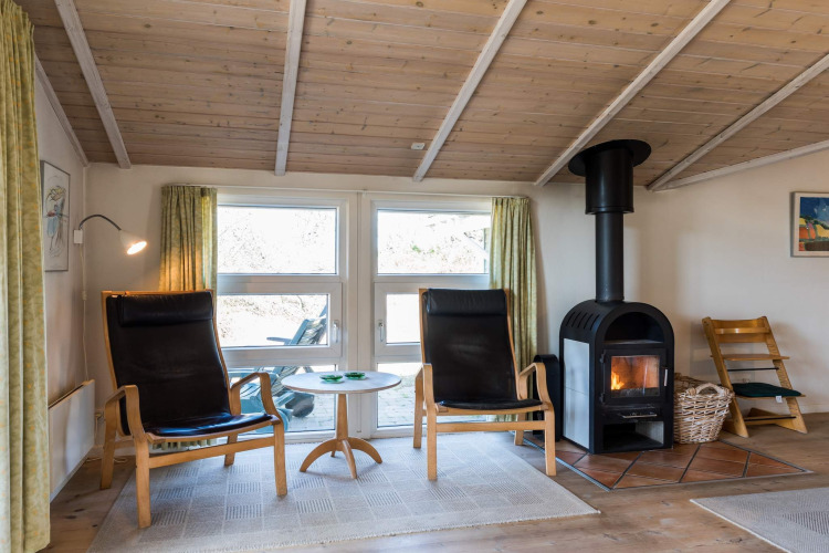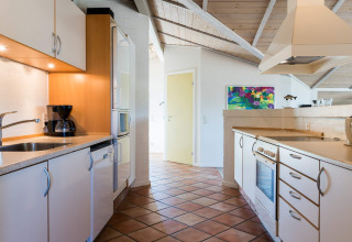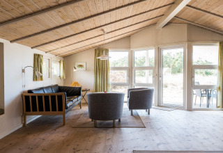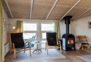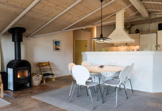 Im Inneren fühlt sich das Haus hell, offen und funktional an – ideal für Gruppen, die Platz ohne Schnickschnack suchen. Das Herzstück des Hauses ist die große, offene Küche mit Wohnbereich. Hier können Sie gemeinsam kochen, lange Abende beim Essen verbringen und sich anschließend auf dem Sofa am Kamin unterhalten, bis spät in die Nacht. Von hier aus gelangen Sie direkt auf die geschützte Terrasse, die teilweise überdacht ist. Ob Sonne oder eine leichte Brise – Sie können trotzdem draußen sitzen, den Grill anzünden und Drinks genießen, bis am Himmel die Sterne erscheinen.