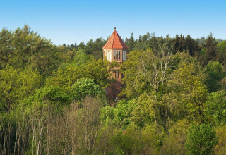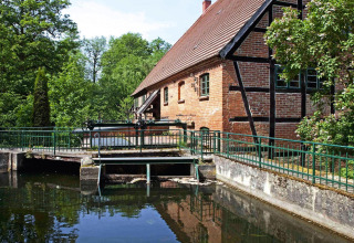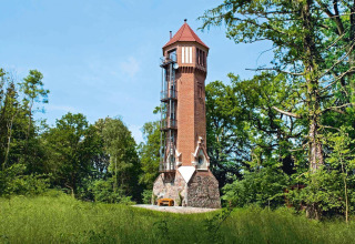 Am Fuß des Turms befindet sich eine historische Wassermühle, an der das Wasser der Nebel vorbeirauscht – sie sorgt für eine zauberhafte Geräuschkulisse während Ihres Aufenthalts. Auch die Umgebung ist idyllisch: Vom Turm aus spazieren Sie direkt in die Parklandschaft des ehemaligen Schlosses Serrahn und weiter ins Naturschutzgebiet Nebeltal.