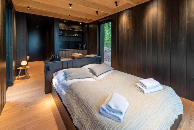 Die Nokken Forest Cabin steht am Waldrand mit freiem Blick über die hügelige Landschaft. Aufgrund ihrer Lage bietet diese Hütte viel Privatsphäre. Das große Fenster ist nach Westen ausgerichtet. Genießen Sie von Ihrem Bett aus die untergehende Sonne über einem endlosen Maisfeld. Sie haben direkten Zugang zum Wald an der Nordseite der Wilsumer Berge. Der Badesee, das Restaurant und der Parkshop sind zu Fuß zu erreichen.