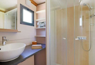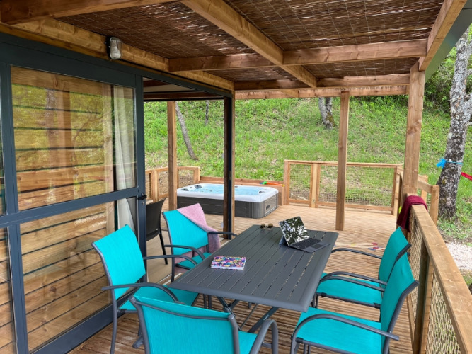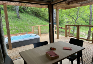 Dieses Chalet ist für maximal fünf Personen geeignet und verfügt über eine Wohnfläche von 25 m². Die überdachte private Terrasse von 18 m² ist mit Gartenmöbeln und einem eigenen Whirlpool ausgestattet. Das Wasser im Spa wird zwischen den Aufenthalten gewechselt und das Sprudelbad wird gereinigt.