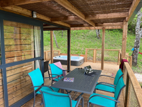 - Überdachte private Terrasse mit Gartenmöbeln und Whirlpool