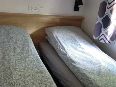 Die Lodge verfügt über 3 Schlafzimmer: eines mit einem Doppelbett, eines mit 2 Einzelbetten nebeneinander und eines mit Etagenbetten. Drei Schlafzimmer bedeuten auch 2 Badezimmer! Es gibt nämlich 2 Duschen und 2 Toilettenkabinen.