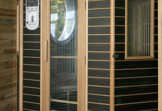 Im Inneren findest du einen gemütlichen Wohnbereich mit Essecke und eine komplett ausgestattete Küche, inklusive Mikrowelle und Senseo-Kaffeemaschine. Das Chalet verfügt über ein Schlafzimmer mit Doppelbett (140 cm) und Stauraum sowie ein separates Zimmer mit Etagenbetten, ideal für Kinder oder Teenager. Das Badezimmer ist mit allen sanitären Annehmlichkeiten ausgestattet.