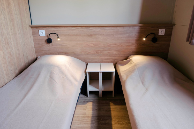 Das Chalet verfügt über drei Schlafzimmer und ist somit für bis zu 6 Personen geeignet. Das Hauptschlafzimmer hat ein geräumiges Doppelbett (160×200), während das zweite Schlafzimmer zwei Einzelbetten (90×200) hat. Das dritte Schlafzimmer ist mit einem Etagenbett (90×200) ausgestattet, ideal für Kinder.