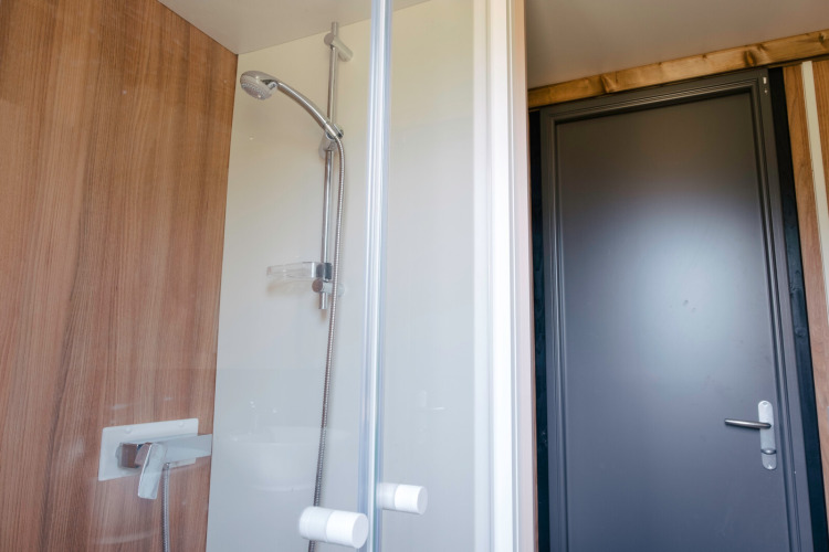 Das Badezimmer im Chalet Portland ist für optimalen Komfort ausgelegt. Mit einem Doppelwaschbecken und einer XL-Dusche (100x80) können Sie sich hier entspannen. Die Toilette ist separat und bietet zusätzlichen Komfort für alle Gäste.