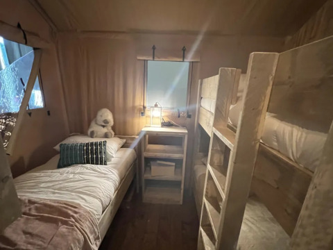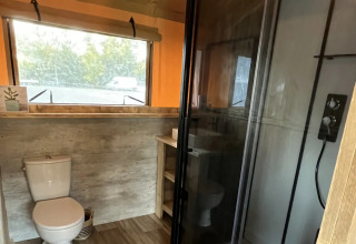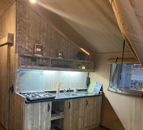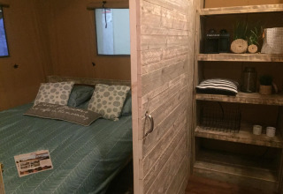 Die Lodge Woody 28 ist eine nachhaltige und komfortable Unterkunft, ideal für Familien, die die Natur lieben. Die 53 m² große Lodge befindet sich in einem ruhigen Teil des Campingplatzes, umgeben von Wald. Sie ist für maximal fünf Personen geeignet. Es gibt zwei Schlafzimmer: eines mit einem Doppelbett und ein Kinderzimmer mit einem Etagenbett und einem Einzelbett. Die Küche ist komplett ausgestattet mit einem 2‑Platten-Herd, Kühlschrank, Mikrowelle, Warm- und Kaltwasser sowie einer Senseo‑Kaffeemaschine. Für zusätzlichen Komfort und Privatsphäre gibt es ein eigenes Badezimmer.