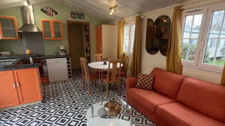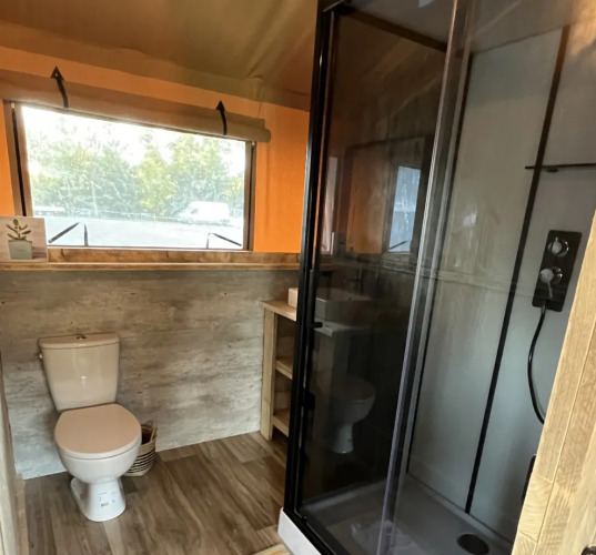 Die überdachte Terrasse von 15 m² ist mit Gartenmöbeln ausgestattet. Die Lodge ist rauchfrei und Haustiere sind unter bestimmten Bedingungen erlaubt. Diese Unterkunft verbindet umweltfreundliches Wohnen mit praktischem Komfort mitten in der Natur.