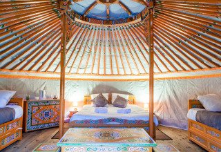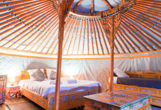 Innen finden Sie einen großzügigen, gemütlichen Wohnraum mit einem Doppelbett und zwei Einzelbetten, von denen bei beiden jeweils ein zusätzliches Bett ausgezogen werden kann. So ist die Yurt für sechs Personen geeignet – ideal für eine Familie oder eine Gruppe von Freunden.
