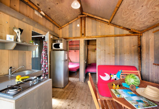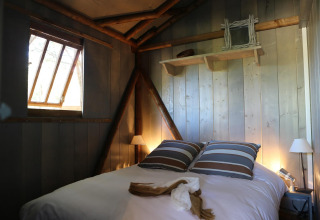 Wachen Sie auf zwischen den Baumwipfeln in einer stimmungsvollen Holzhütte von 38 m², die auf Pfählen gebaut ist – für einen einzigartigen Aufenthalt mitten in der Natur. Diese komfortable Unterkunft ist für vier Personen geeignet und verfügt über zwei gemütliche Schlafzimmer: eines mit einem Doppelbett (140 x 190 cm) und eines mit zwei Einzelbetten (90 x 190 cm). Im Inneren lädt das großzügige Wohnzimmer zum entspannten Beisammensein ein, während die komplett ausgestattete Küche und das private Badezimmer mit Dusche zusätzlichen Komfort bieten. Draußen bietet die überdachte Terrasse viel Platz, um die frische Morgenluft und lange Abende im Freien zu genießen. Dank des warmen Chalet-Stils und der erhöhten Lage fühlt sich jeder Moment wie ein ganz besonderes Abenteuer in der Natur an.