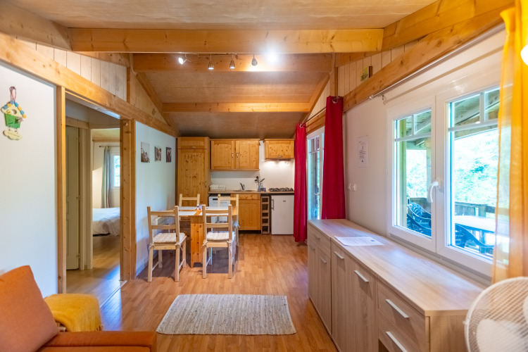 Dieses gemütliche Holzchalet bietet Platz für 6 Personen und verbindet den Komfort von zu Hause mit einer wunderschönen, ruhigen Umgebung. Das gemütliche Wohnzimmer hat eine Sitzecke, die sich in ein Doppelbett verwandeln lässt, einen Essbereich und eine offene Küche mit Kühlschrank, Herd, Mikrowelle, Geschirrspüler und Kaffeemaschine. Es gibt zwei Schlafzimmer: eins mit einem Doppelbett und eins mit zwei Einzelbetten. Das Badezimmer ist mit einer Dusche ausgestattet und es gibt eine separate Toilette. Auf der 12 m² großen überdachten Veranda kannst du die Natur genießen, während die Gartengarnitur einen schönen Platz zum gemeinsamen Entspannen bietet.