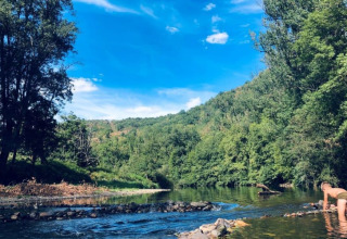 Kleiner Campingplatz im Tarn mit Fluss und grünen Hügeln; Camping La Prade