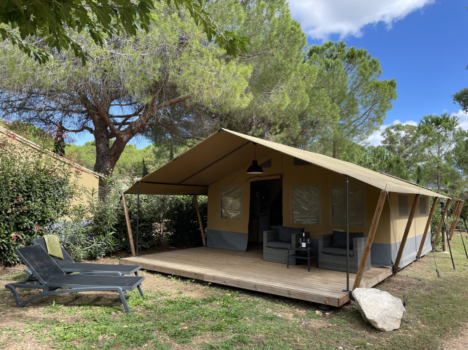 Dieses einzigartige Safarizelt ist komplett ausgestattet für den perfekten Glamping-Urlaub! Die hölzernen Details und die aufrollbare Front geben Ihnen das echte Outdoor-Feeling des Campings, mit allem Komfort von zu Hause.