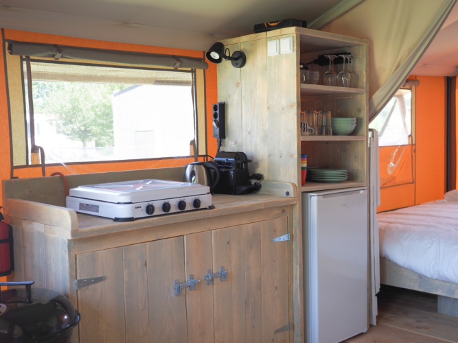 Das Zelt ist mit einer gemütlichen Veranda mit Markise ausgestattet, für einen schönen Aufenthalt im Freien. Das Safarizelt verfügt über eine voll ausgestattete Küche mit Inventar und einem thermisch gesicherten Kocher, der nach draußen verlegt werden kann. Perfekt für das Kochen im Freien! Ein Kühlschrank, eine Kaffeemaschine und ein Wasserkocher sind ebenfalls vorhanden. Außerdem verfügt das Safarizelt über zwei Schlafkabinen. Eine Schlafkabine hat ein Doppelbett und die andere Schlafkabine hat Etagenbetten und ein Einzelbett. Alle Betten sind mit Decken, Kissen und Bettwäsche ausgestattet.