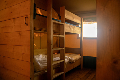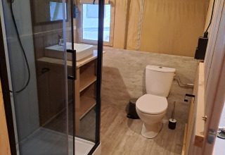 Das Safarizelt mit Sanitäranlagen ist ein luxuriöses Safarizelt für bis zu 4 Personen, eine ideale Unterkunft für einen Familien- oder Gruppenurlaub! Mit einer Grundfläche von 25m2. Essen Sie gemeinsam am großen Tisch mit Stühlen, öffnen Sie die Vorderseite des Zeltes komplett und genießen Sie die Aussicht und die frische Luft. Bereiten Sie Mahlzeiten in der voll ausgestatteten Küche zu und entspannen Sie sich am Ende des Tages auf einem der luxuriösen Sessel oder in einem der 2 Schlafzimmer. In einem Schlafzimmer finden Sie ein großes Doppelbett, im anderen ein Etagenbett. Mit einer Länge von 2 Metern sind die Betten sowohl für Kinder als auch für Erwachsene geeignet. Um Ihren Glamping-Urlaub noch luxuriöser zu gestalten, ist das Safarizelt mit einem kompletten Badezimmer mit Dusche, Toilette und Waschbecken ausgestattet.