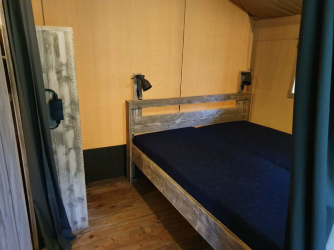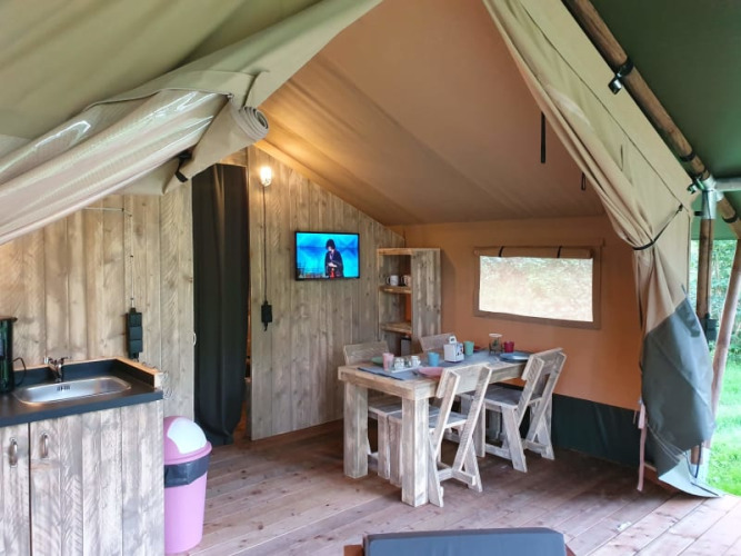 Das Safarizelt mit Sanitäranlagen ist ein luxuriöses Safarizelt für bis zu 4 Personen, eine ideale Unterkunft für einen Familien- oder Gruppenurlaub! Mit einer Grundfläche von 40m2. Essen Sie gemeinsam am großen Tisch mit Stühlen, öffnen Sie die Vorderseite des Zeltes komplett und genießen Sie die Aussicht und die frische Luft. Bereiten Sie Mahlzeiten in der voll ausgestatteten Küche zu und entspannen Sie sich am Ende des Tages auf einem der luxuriösen Sessel oder in einem der 2 Schlafzimmer. In einem Schlafzimmer finden Sie ein großes Doppelbett, im anderen ein Etagenbett. Mit einer Länge von 2 Metern sind die Betten sowohl für Kinder als auch für Erwachsene geeignet. Um Ihren Glamping-Urlaub noch luxuriöser zu gestalten, ist das Safarizelt mit einem kompletten Badezimmer mit Dusche, Toilette und Waschbecken ausgestattet.