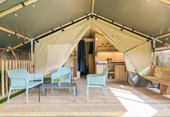 Dieses einzigartige Safarizelt mit Badezimmer ist mit allem Komfort für den perfekten Glamping-Urlaub ausgestattet! Durch die Holzelemente und die aufrollbare Vorderseite erhältst du das echte Outdoor-Gefühl des Campings, mit allem Komfort wie zu Hause. Das Zelt verfügt über eine gemütliche Veranda mit Vordach, um wunderbar draußen verweilen zu können. Das Safarizelt hat eine komplett ausgestattete Küche mit Inventar und enthält einen vierflammigen gesicherten Gasherd, einen Kühlschrank, eine Kaffeemaschine und einen Wasserkocher. Außerdem gibt es zwei Schlafkabinen im Zelt. In einer Schlafkabine steht ein Doppelbett (160x200 cm) und in der anderen stehen zwei Etagenbetten. Es gibt auch ein komplettes Badezimmer im Zelt mit einer Dusche, einer Toilette und einem Waschbecken.