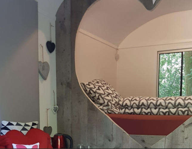 Überraschen Sie Ihren Partner und genießen Sie eine einzigartige Übernachtung wie nie zuvor. Schlafen Sie in einem speziellen herzförmigen Boxbett und erleben Sie die Liebe für eine Weile auf eine andere Art. Herzen und Liebe um Sie herum!