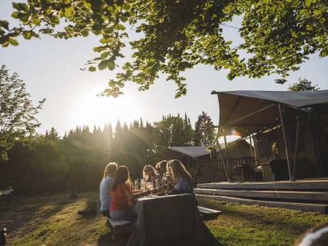 Die Atmosphäre, die entspannte, schöne Lage unseres Zeltes mit eigenem Whirlpool, die kostenlose Nutzung der Duos und Kanus, die Ruhe, das Grün und das Wasser