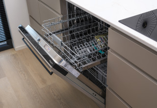 Die Unterkunft ist 70 m² groß und verfügt über ein gemütliches Wohnzimmer mit viel Tageslicht, eine Sitzecke mit TV, einen großen Esstisch und eine moderne offene Küche mit Kochinsel, Kombi-Backofen, Geschirrspüler und Induktionskochfeld mit integriertem Dunstabzug.