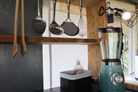 Die praktische Küchenzeile ist komplett ausgestattet mit einem Kühlschrank und einem 4-Flammen-Gasherd. Noch besser: Sie steht auf Rollen, sodass Sie sie an sonnigen Tagen einfach nach draußen auf die überdachte Terrasse schieben können. Hier entspannen Sie bei einem Getränk, genießen lange Sommerabende und beobachten, wie die friesische Landschaft beim Sonnenuntergang langsam ihre Farben verändert.