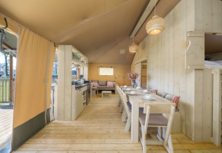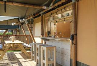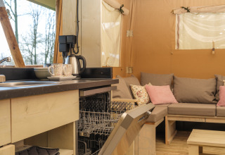 Beginnen Sie Ihren Tag entspannt mit einer frischen Tasse Kaffee aus der Senseo, bereiten Sie ein köstliches Frühstück in der komplett ausgestatteten Küche zu und planen Sie einen Tag voller Abenteuer. Dank des aufrollbaren Zeltstoffes können Sie das Innere mühelos mit dem Außenbereich verbinden. Während des Kochens genießen Sie nicht nur den Komfort der Küche, sondern auch den wunderschönen Blick auf das Feld und den Spielplatz. Darüber hinaus verfügt die Lodge über eine eingebaute Bar, die perfekt ist, um bei einem Getränk oder Snack die Aussicht zu genießen. Nach einem erlebnisreichen Tag entspannen Sie in der gemütlichen Sitzecke oder auf der geräumigen Veranda für einen ruhigen Abend.