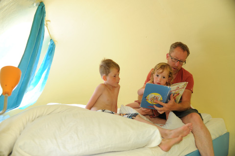 Neben dem bequemen Bett gibt es auch eine gemütliche Bank und eine praktische Schublade für Ihre persönlichen Gegenstände. Obwohl Sie im Ei kein eigenes Bad haben, können Sie die luxuriösen königlichen Bäder des Campingplatzes benutzen. Hier können Sie herrlich duschen und sich für einen weiteren Tag voller Abenteuer erfrischen.