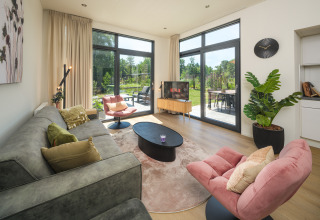 Die Lodge verfügt über einen hellen und luftigen Wohnbereich mit zahlreichen Fenstern, die für viel natürliches Licht und ein einladendes Ambiente sorgen. Das geschmackvoll eingerichtete Wohnzimmer bietet viel Platz zum Entspannen und verfügt über einen direkten Zugang zu einer privaten Terrasse, auf der Sie die frische Luft und die schöne Aussicht auf die Umgebung genießen können.