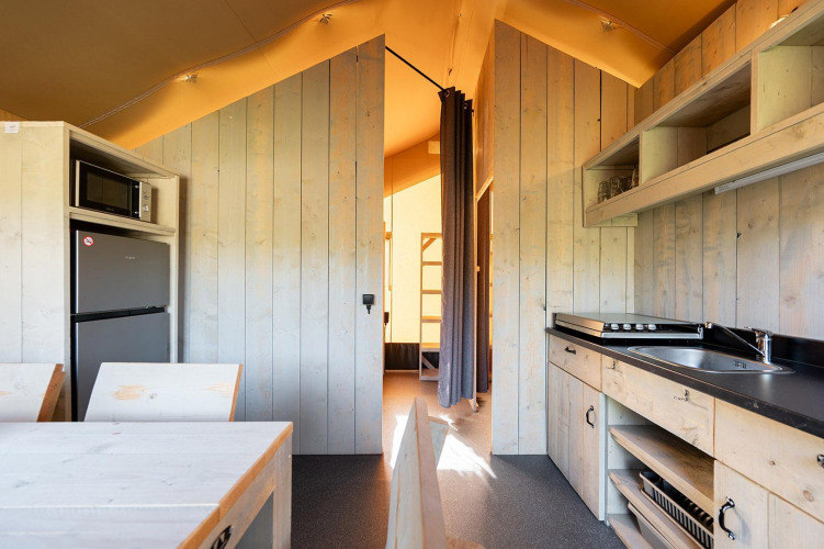 Im Inneren finden Sie einen gemütlichen Wohnbereich mit einem Ecksofa und zwei Korbsesseln mit Beistelltisch, ideal zum Entspannen nach einem Tag voller Abenteuer. Das Zelt verfügt über eine voll ausgestattete Küche, ein Badezimmer mit Dusche, Toilette und Waschbecken sowie ein Schlafzimmer mit Doppelbett und ein Schlafzimmer mit einem Dreibett. Betreten Sie die große Terrasse und entspannen Sie sich auf dem bequemen gepolsterten Sofa oder genießen Sie eine köstliche Mahlzeit am Esstisch. Nehmen Sie Platz in der Hängematte mit Ständer oder entspannen Sie sich an dem Gerüstholztisch mit zwei Bänken. Für zusätzlichen Komfort stehen zwei Loungesessel mit Allwetterkissen zur Verfügung.