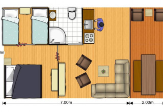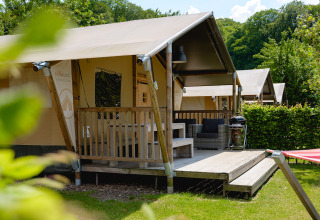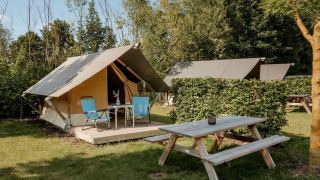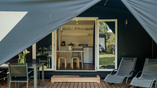 Die Nomad ist 5 x 7 m groß, hat eine Terrasse von 2 x 5 m und ist am höchsten Punkt 3,30 m hoch. Die gesamte Vorderseite des Zeltes lässt sich öffnen, sodass Sie die Veranda und den Innenraum miteinander verbinden können. Die Schlafbereiche sind mit Gerüstholz getrennt, wodurch Sie noch mehr Privatsphäre haben. In den Schlafbereichen befinden sich Kleiderschränke mit Hänge- und Liegebereichen. Die Betten sind 2 Meter lang und sowohl für Kinder als auch für Erwachsene geeignet. Diese Zelte finden Sie auf dem Lageplan bei den Nummern 130 bis 133 und 230 bis 233.