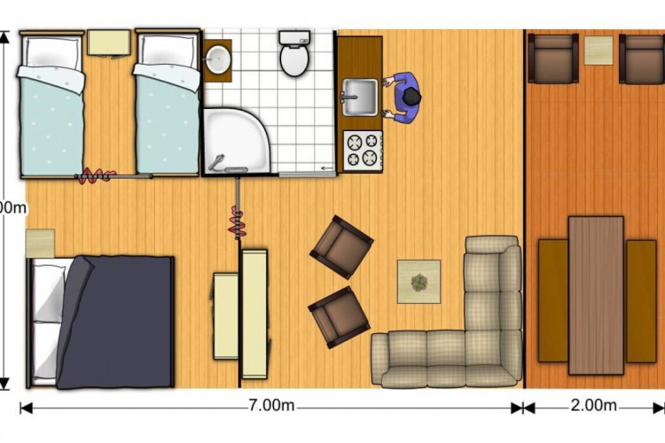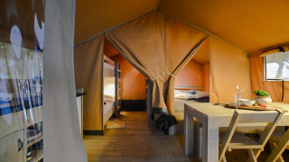 Es ist ein robustes Safarizelt mit einem superstarken Holzrahmen. Das Zelt ist mit einem kompletten Badezimmer inklusive Duschkabine, Toilette und Waschbecken ausgestattet. Sie müssen nicht mehr mit der Klopapierrolle unterm Arm zum Sanitärgebäude gehen. Die Nomad ist für sechs Personen geeignet und verfügt über zwei Schlafbereiche: eines mit einem Doppelbett und eines mit zwei Etagenbetten.