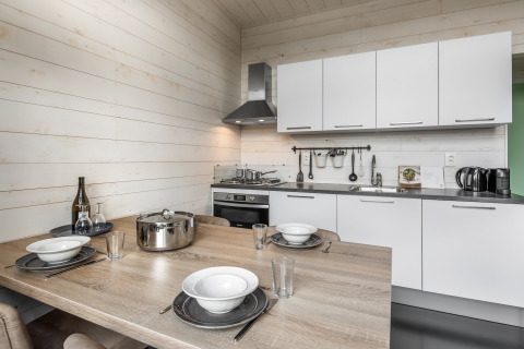 Innen erwartet Sie ein heller, offener Wohnbereich mit Fußbodenheizung, eine gemütliche Sitzecke und ein Smart-TV für entspannte Filmabende. Die voll ausgestattete Küche verfügt über einen Geschirrspüler und eine Kombi-Mikrowelle, sodass das Kochen zum Kinderspiel wird – egal, ob Sie ein schnelles Frühstück oder ein einfaches Familienessen zubereiten.