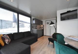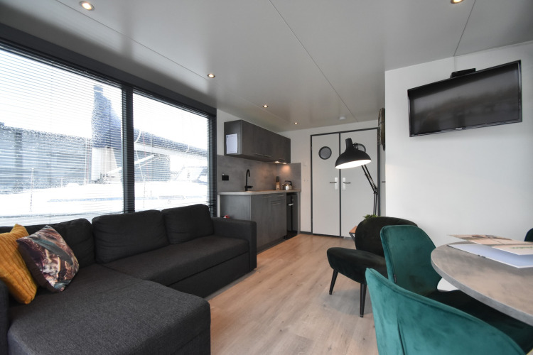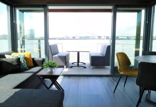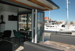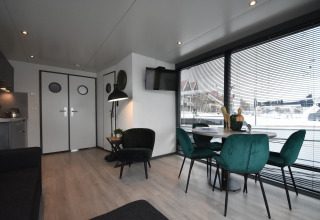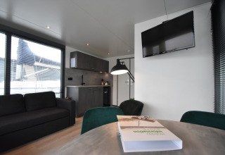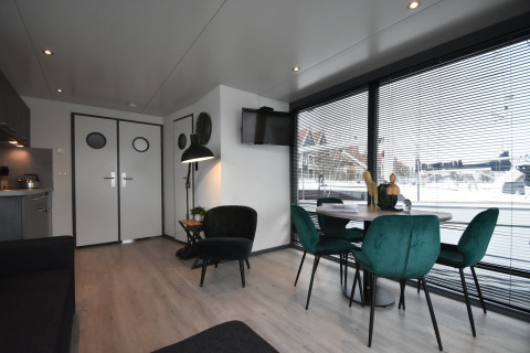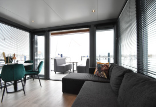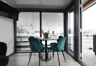 Im Inneren finden Sie einen hellen Wohn- und Essbereich, in dem Sie sich nach einem Tag voller Entdeckungen entspannen können. Lehnen Sie sich in die bequemen Sitzgelegenheiten zurück, schauen Sie einen Film oder genießen Sie ein ausgiebiges Frühstück am Esstisch, während Sie das Geschehen im Yachthafen beobachten. Die offene Küche ist komplett ausgestattet mit Kochfeld, Dunstabzugshaube, Kühlschrank, Kaffeemaschine und Wasserkocher, sodass Sie ganz einfach eigene Mahlzeiten oder einen schnellen Snack zubereiten können, bevor Sie aufbrechen.