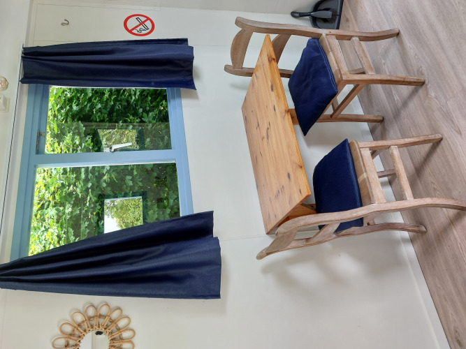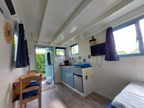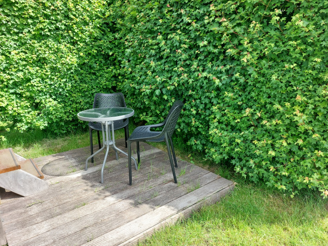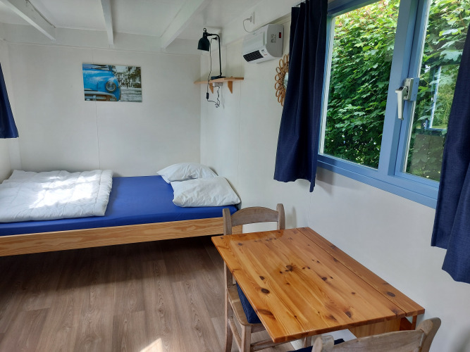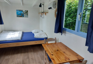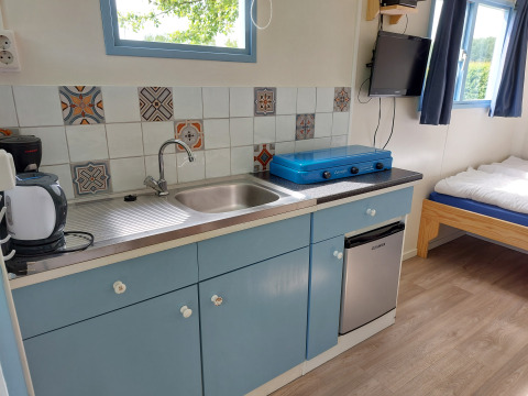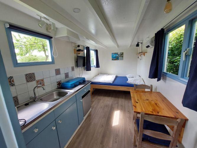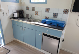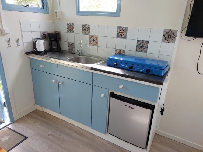 Über die Veranda betreten Sie die Küche und das Wohnzimmer. Snuitje hat alle Küchenutensilien, die Sie brauchen. Denken Sie an einen Wasserkocher, einen Kühlschrank und eine Kaffeemaschine. Fließend kaltes Wasser ist auch vorhanden. Zum Kochen steht ein Gasherd mit 3 Flammen zur Verfügung. Teller, Pfannen, Tassen usw. sind natürlich auch vorhanden. Im Wohnzimmer gibt es 2 Stühle und einen Tisch, an dem Sie bequem essen können. Es gibt auch einen Fernseher mit digitenne.