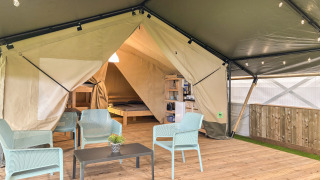 Das Safarizelt mit Sanitäranlagen ist ein luxuriöses Safarizelt für bis zu 4 Personen, eine ideale Unterkunft für einen Familien- oder Gruppenurlaub! Mit einer Grundfläche von 25m2. Essen Sie gemeinsam am großen Tisch mit Stühlen, öffnen Sie die Vorderseite des Zeltes komplett und genießen Sie die Aussicht und die frische Luft. Bereiten Sie Mahlzeiten in der voll ausgestatteten Küche zu und entspannen Sie sich am Ende des Tages auf einem der luxuriösen Sessel oder in einem der 2 Schlafzimmer. In einem Schlafzimmer finden Sie ein großes Doppelbett, im anderen ein Etagenbett. Mit einer Länge von 2 Metern sind die Betten sowohl für Kinder als auch für Erwachsene geeignet. Um Ihren Glamping-Urlaub noch luxuriöser zu gestalten, ist das Safarizelt mit einem kompletten Badezimmer mit Dusche, Toilette und Waschbecken ausgestattet.