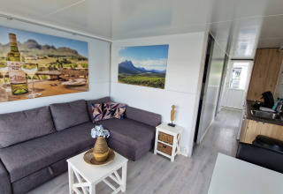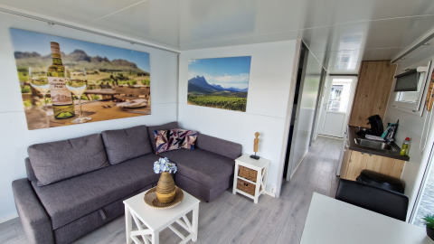 Die Hafenlodge hat zwei Schlafzimmer und ein Schlafsofa. Das Hauptschlafzimmer hat ein Doppelbett und das andere Schlafzimmer hat ein Etagenbett. Im Wohnzimmer gibt es ein Schlafsofa für zwei Personen. Damit ist das Hafenhaus groß genug für bis zu sechs Personen, am besten für bis zu vier Erwachsene und zwei Kinder. Es gibt eine kleine, aber voll ausgestattete Küche mit zwei Herdplatten, einem Kühlschrank, einer Kaffeemaschine und allen grundlegenden Funktionen, die man zum Kochen braucht. Die Lodges verfügen außerdem über einen Fernsehanschluss und ein modernes Bad mit Dusche, Toilette und Waschbecken.