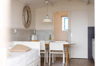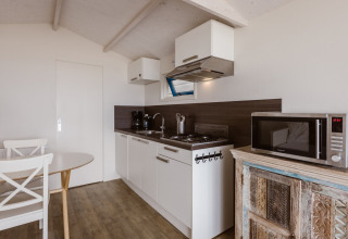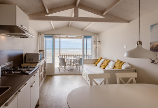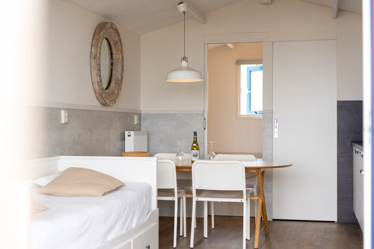 Innen ist Ihr Strandhaus hell, komfortabel und clever eingerichtet. Das Wohnzimmer verfügt über große Fenster und ein bequemes Sofa, das sich leicht in ein Doppelbett verwandeln lässt – perfekt, wenn Sie mit Familie oder Freunden unterwegs sind. Die offene Küche ist mit allem ausgestattet, was Sie für einfache Urlaubsmahlzeiten brauchen, einschließlich einer Mikrowelle, sodass Sie zwischen dem Schwimmen oder Surfen schnell Snacks aufwärmen können.