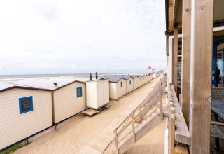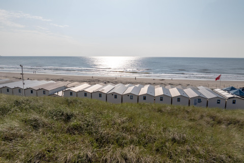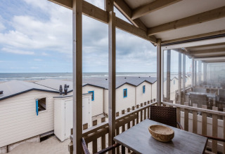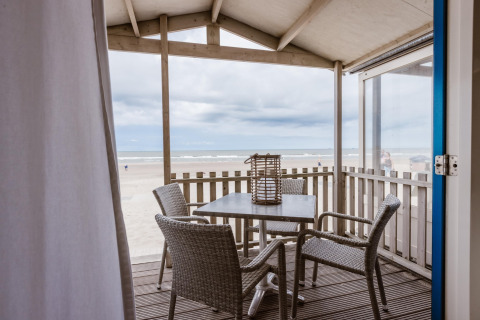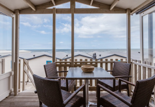Draußen findet das eigentliche Urlaubserlebnis statt. Sie haben Ihre eigene überdachte Terrasse mit Gartenmöbeln, die sich auf der Dünen-Seite und etwa 2 Meter erhöht befindet. Dank dieser Höhe haben Sie von Ihrer Terrasse aus immer noch einen schönen Blick aufs Meer – ideal für den ersten Kaffee am Morgen oder einen Sundowner am Abend.