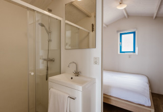 Es gibt ein separates Schlafzimmer mit einem Doppelbett, ideal für eine erholsame Nachtruhe nach einem Tag an der frischen Meeresluft. Das Badezimmer ist kompakt, aber komplett, mit Dusche und Toilette. Alles ist so gestaltet, dass Ihr Aufenthalt unkompliziert und entspannt ist, damit Sie sich ganz aufs Genießen des Strandes konzentrieren können.