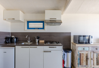 Innen wirkt der helle Wohnbereich gemütlich und einladend, mit großen Fenstern, die den Strandblick direkt in Ihr Urlaubsdomizil holen. Das bequeme Sofa lässt sich einfach in ein Doppel-Schlafsofa verwandeln, sodass hier bis zu vier Personen ohne Enge schlafen können. Die offene Küche ist komplett mit allem Nötigen ausgestattet, einschließlich Mikrowelle, sodass Sie schnell ein Frühstück, ein einfaches Mittagessen oder ein entspanntes Abendessen nach einem langen Tag am Meer zubereiten können.