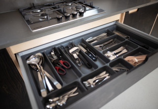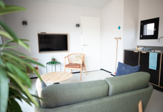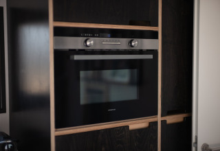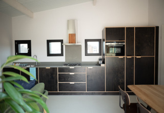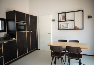Im Inneren wirkt die Lodge durch die großen Fenster und die stilvolle Einrichtung hell und komfortabel. Im lichtdurchfluteten Wohnbereich finden Sie eine gemütliche Sitzecke mit Smart-TV sowie einen Esstisch für gemeinsame Mahlzeiten oder Spieleabende. Die offene Küche ist voll ausgestattet mit Geschirrspüler, Mikrowelle, Nespresso-Maschine und Quooker, sodass Sie im Handumdrehen Ihr Lieblingsfrühstück oder ein einfaches Abendessen zubereiten können.