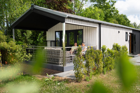 Die Lodge hat ein Schlafzimmer und 1 Badezimmer mit Dusche, Waschbecken, Toilette und Sauna. Durch die großen Glasschiebetüren gelangen Sie auf die geräumige, sonnige Terrasse mit Gartenmöbeln, wo Sie bis in die späten Abendstunden die Natur genießen können.