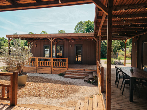 Überdachte Terrasse, auf der Sie herrlich entspannen können. Mit Gartenmöbeln und Blick auf die Natur.