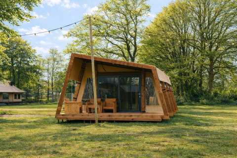 Draußen genießt du eine Veranda mit Terrassenmöbeln und freiem Blick über die Wiese. Hier kannst du in Ruhe frühstücken, mit den Kindern spielen oder dich nach einem Tag in der Umgebung entspannen. Die Unterkunft liegt an einem autofreien Platz auf dem Pop-up-Glamping und bietet kostenloses WLAN. Haustiere sind erlaubt, sodass die ganze Familie einen Aufenthalt mitten in der Natur genießen kann.