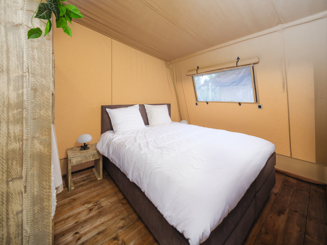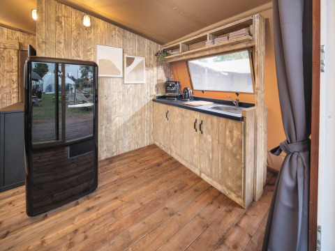 Abenteuer und Komfort vereinen sich in diesem Tribe Lodge Safarizelt für 5 Personen. Das Zelt befindet sich auf einem Pop-up-Glamping mit Festival-Atmosphäre, ganz in der Nähe des Hafens, des Pop-up-Restaurants und der Regge. Im Inneren findest du zwei Schlafzimmer: eins mit einem Doppelbett und eins mit einem Etagenbett und einem Einzelbett. Bettwäsche ist vorhanden. Das Zelt verfügt über ein eigenes Bad mit Dusche, Regendusche, Toilette und Waschbecken. Im Wohnbereich gibt es einen Esstisch und einen Smart-TV. Die ausgestattete Küche verfügt über eine Kochgelegenheit, einen Geschirrspüler, eine Kühl-Gefrierkombination und eine Filterkaffeemaschine.