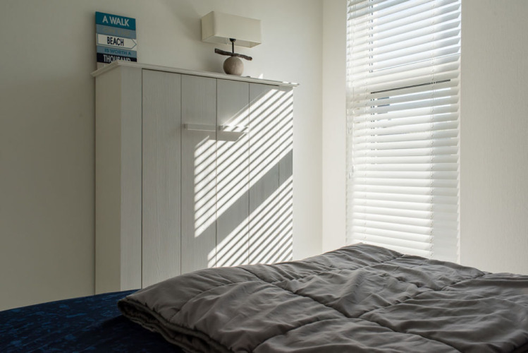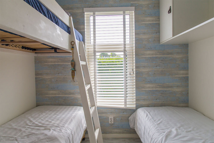 Schlafzimmer 2: Dieses schöne Schlafzimmer hat ein Etagenbett und ein 1-Personen-Boxspringbett, Leselampen und einen Kleiderschrank.