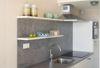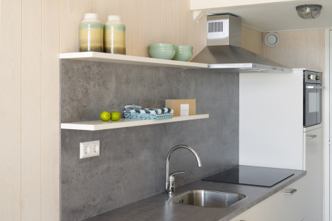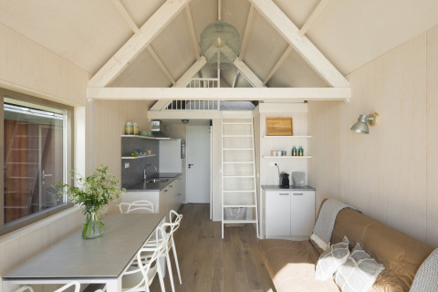 Im Inneren ist das Strandhaus gemütlich, hell und clever eingerichtet. Im Wohnzimmer finden Sie eine komfortable Sitzecke mit Smart-TV – perfekt für einen entspannten Filmabend nach einem langen Tag an der frischen Meeresluft. Das Sofa kann in ein zusätzliches Bett umgewandelt werden, sodass Sie hier bequem mit bis zu vier Personen übernachten können.