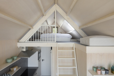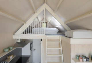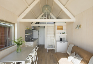 Die offene Küche ist komplett ausgestattet mit einer Mikrowelle und einer Spülmaschine, sodass das Kochen einfach ist und Sie keine Zeit mit Abwaschen verlieren. Es gibt ein Schlafzimmer mit Etagenbett – ideal für Kinder oder Freunde – sowie ein kuscheliges Schlafloft mit Doppelbett. Dieses Loft erreichen Sie über eine steile Treppe vom Wohnzimmer aus und werden mit einem fantastischen Blick über den Strand und die Nordsee belohnt, sogar wenn Sie im Bett liegen.