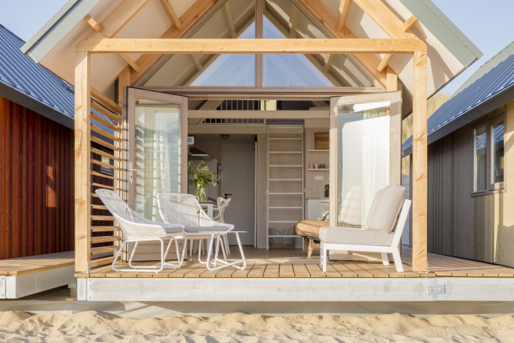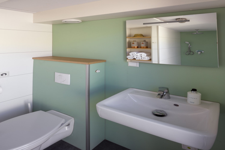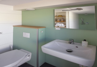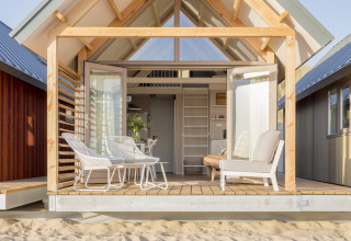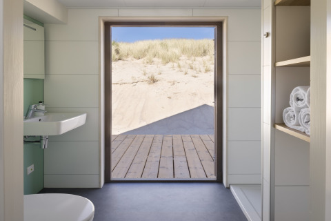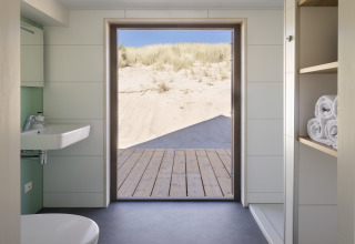 Das Badezimmer ist kompakt, aber komplett mit Dusche und WC ausgestattet. Draußen ist die überdachte Veranda mit Loungemöbeln Ihr privater Platz auf den Dünen. Genießen Sie Ihren Morgenkaffee mit weitem Meerblick oder beobachten Sie den Sonnenuntergang mit einem Getränk in der Hand – der Strand liegt Ihnen sprichwörtlich zu Füßen.